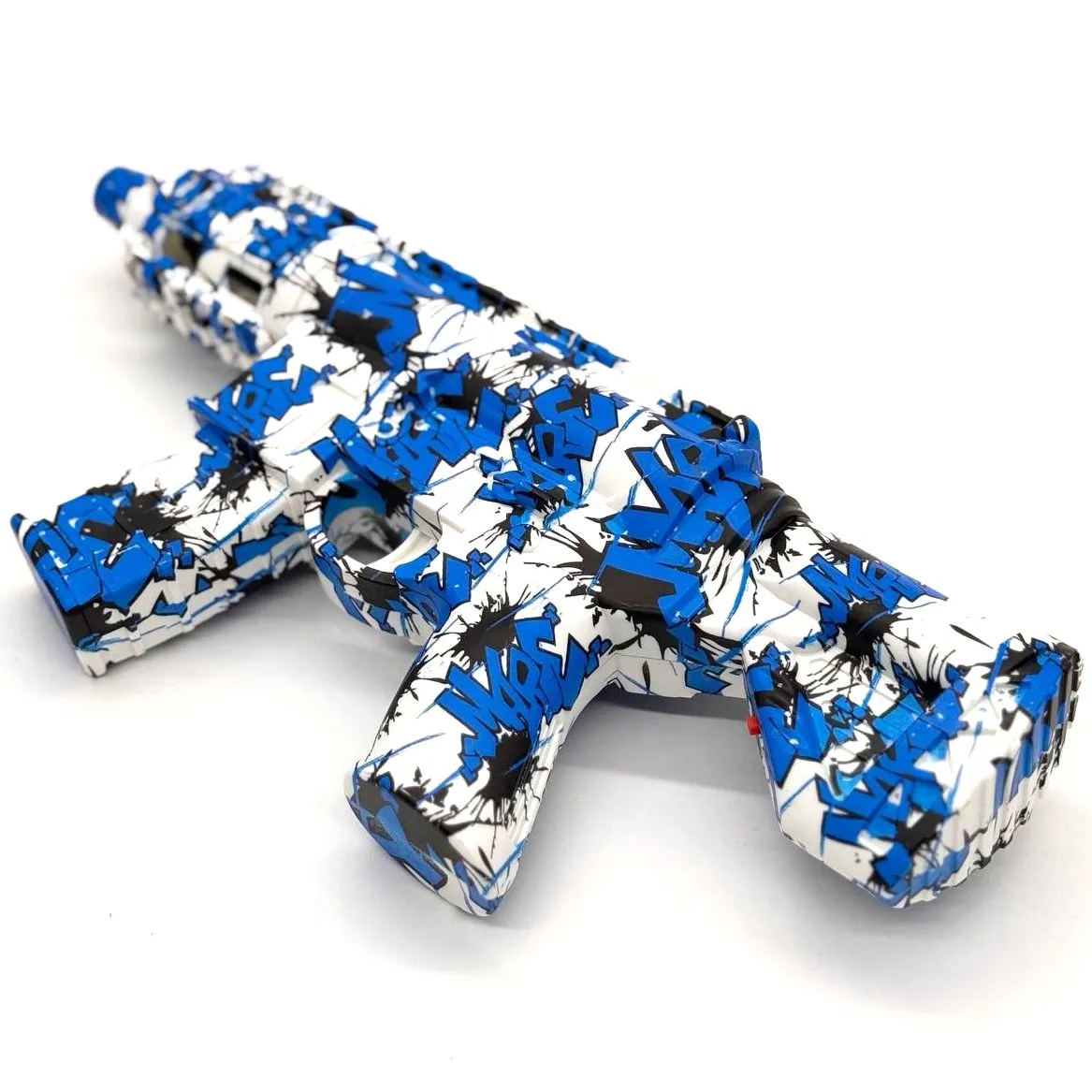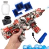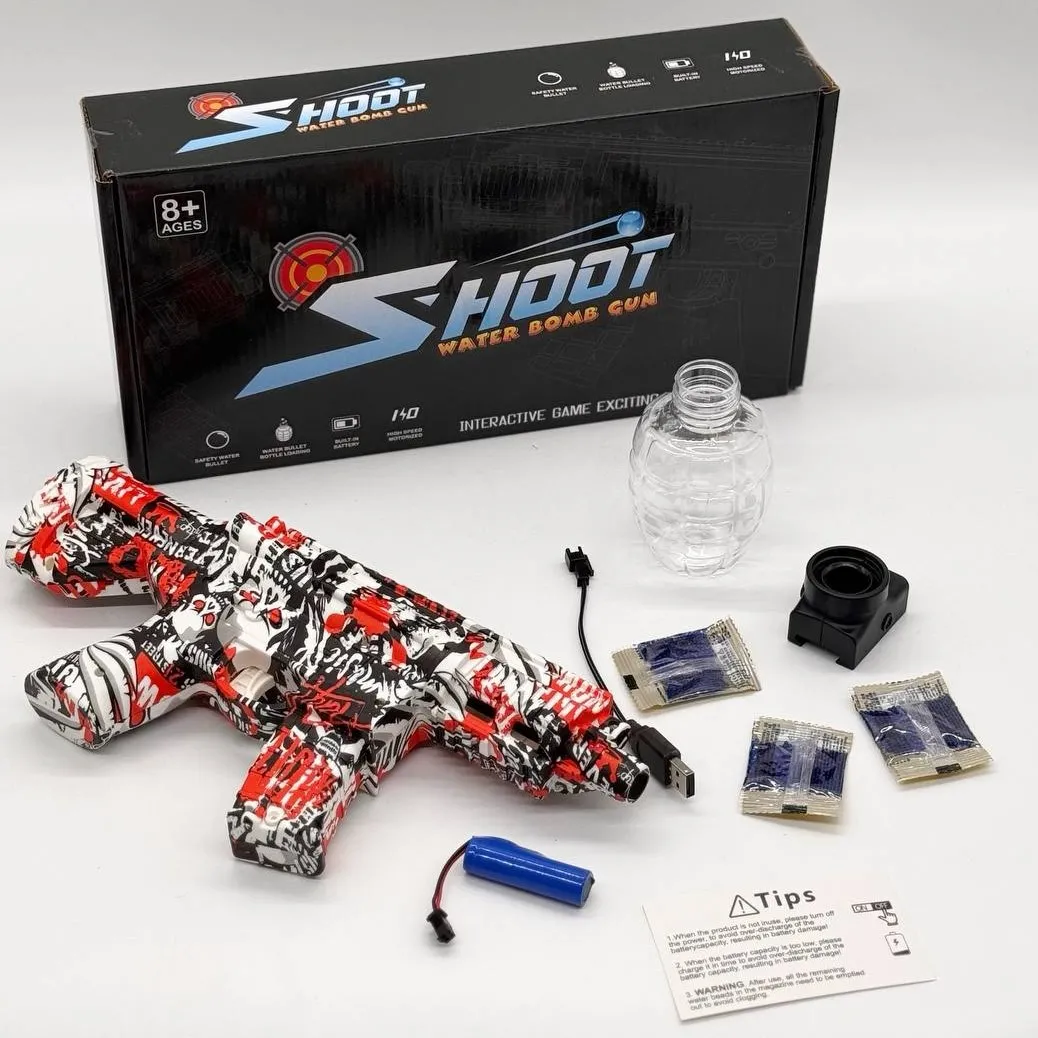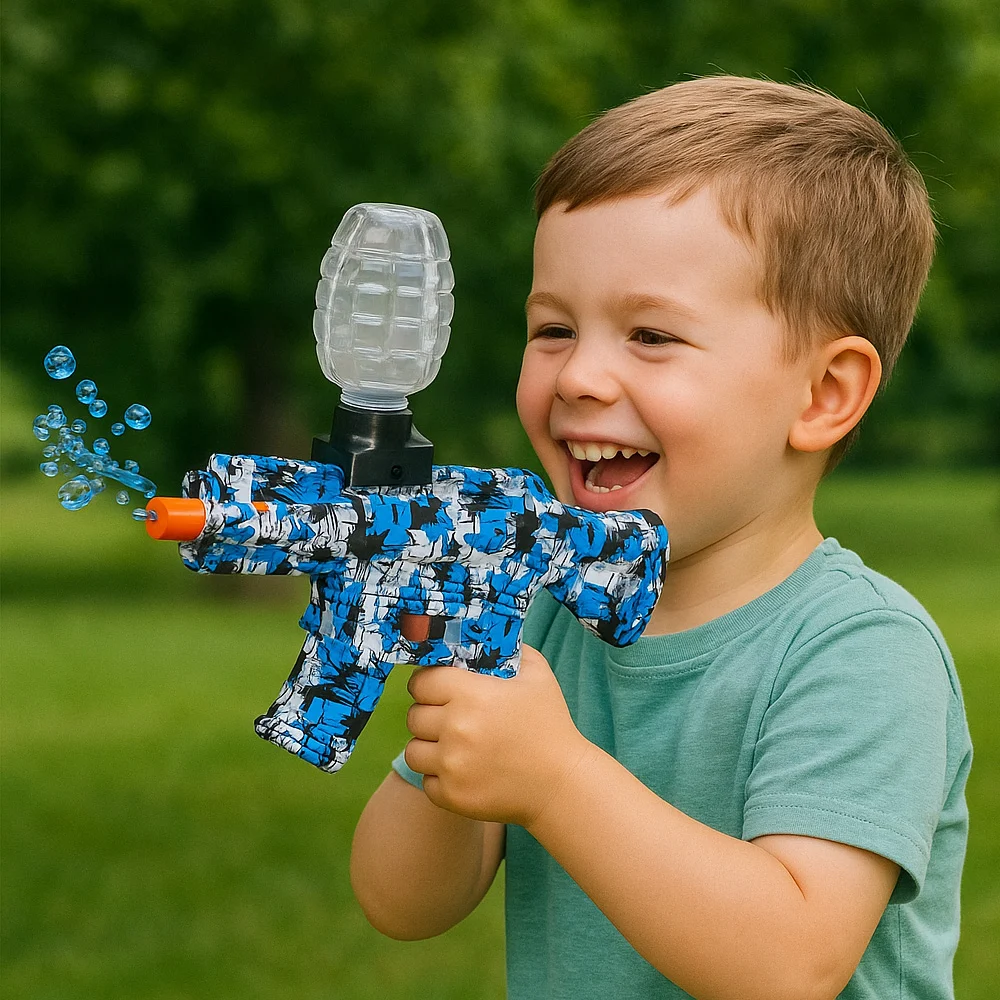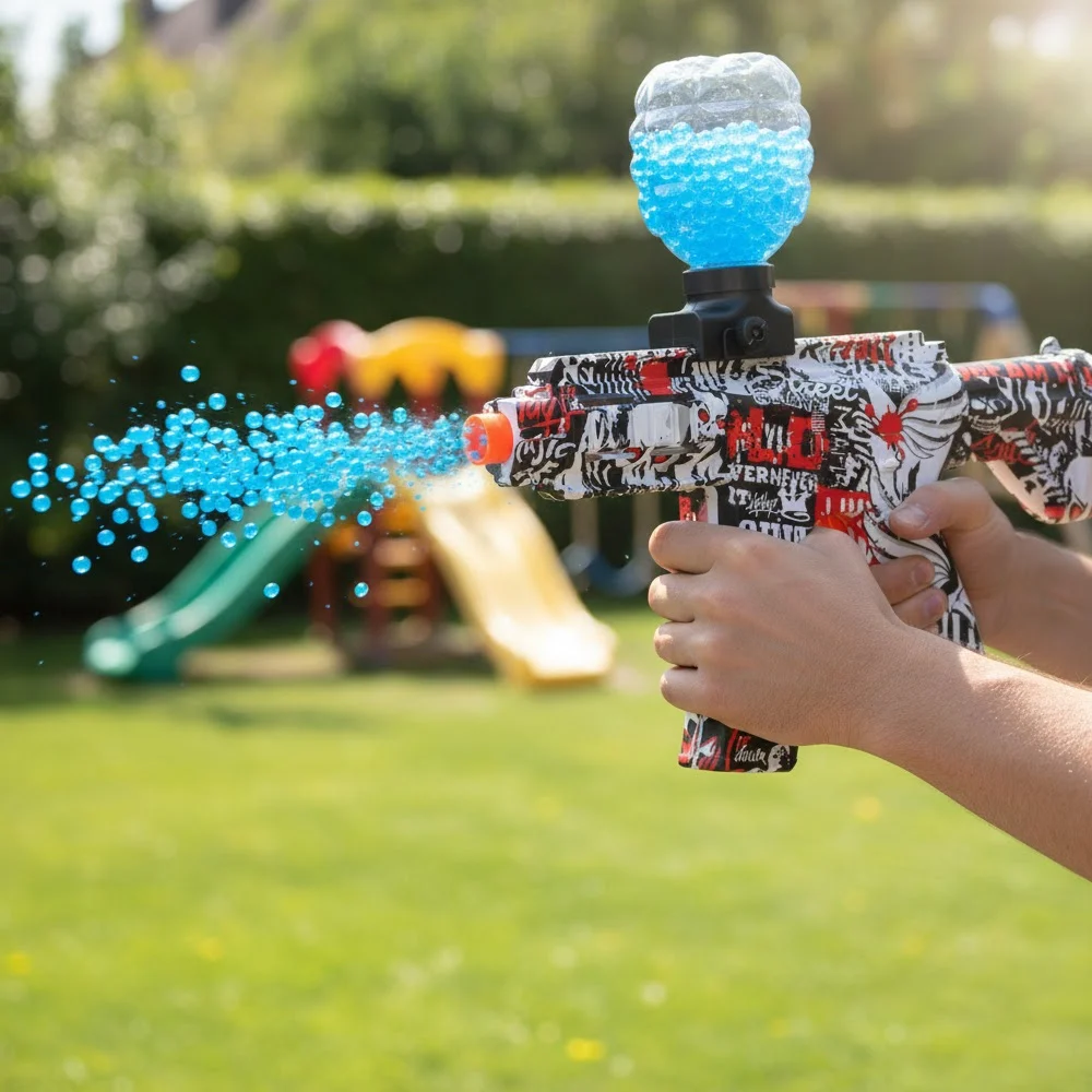 Игрушка работает от аккумулятора, который заряжается через USB-кабель (входит в комплект). Это позволяет использовать её многократно без необходимости покупать батарейки. Полностью заряженное устройство обеспечивает длительное время игры, делая процесс максимально комфортным и увлекательным. В качестве игровых элементов используются специальные мягкие гелевые шарики (орбизы), которые нужно предварительно замочить в воде