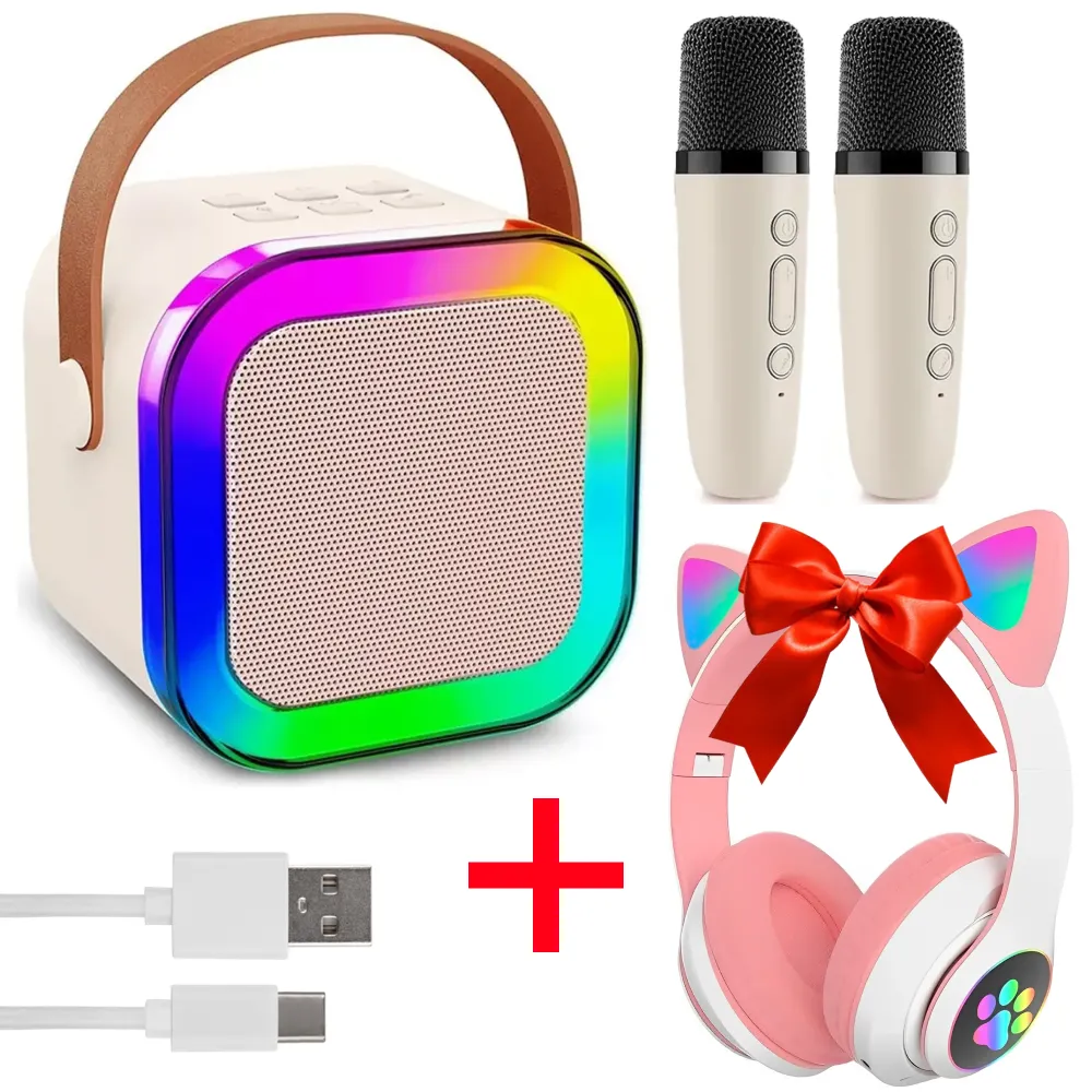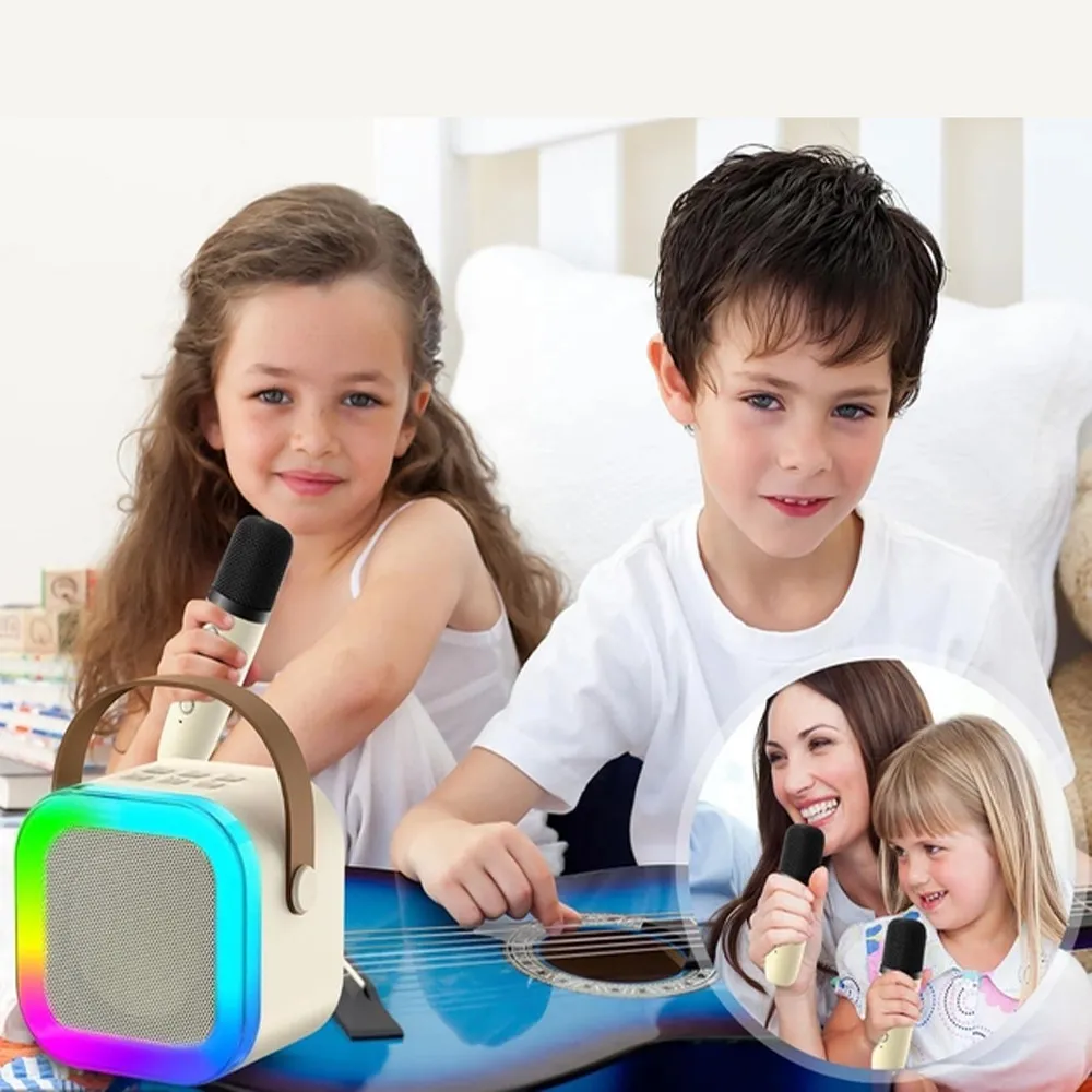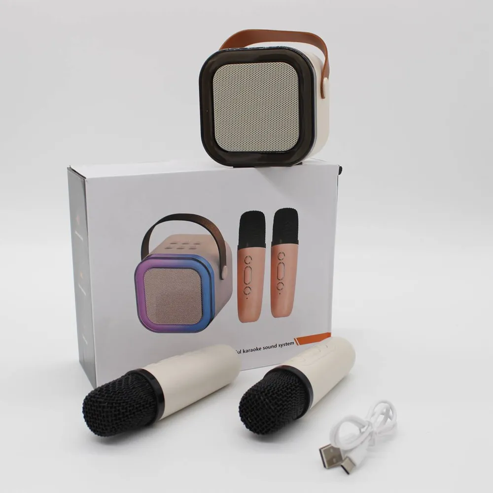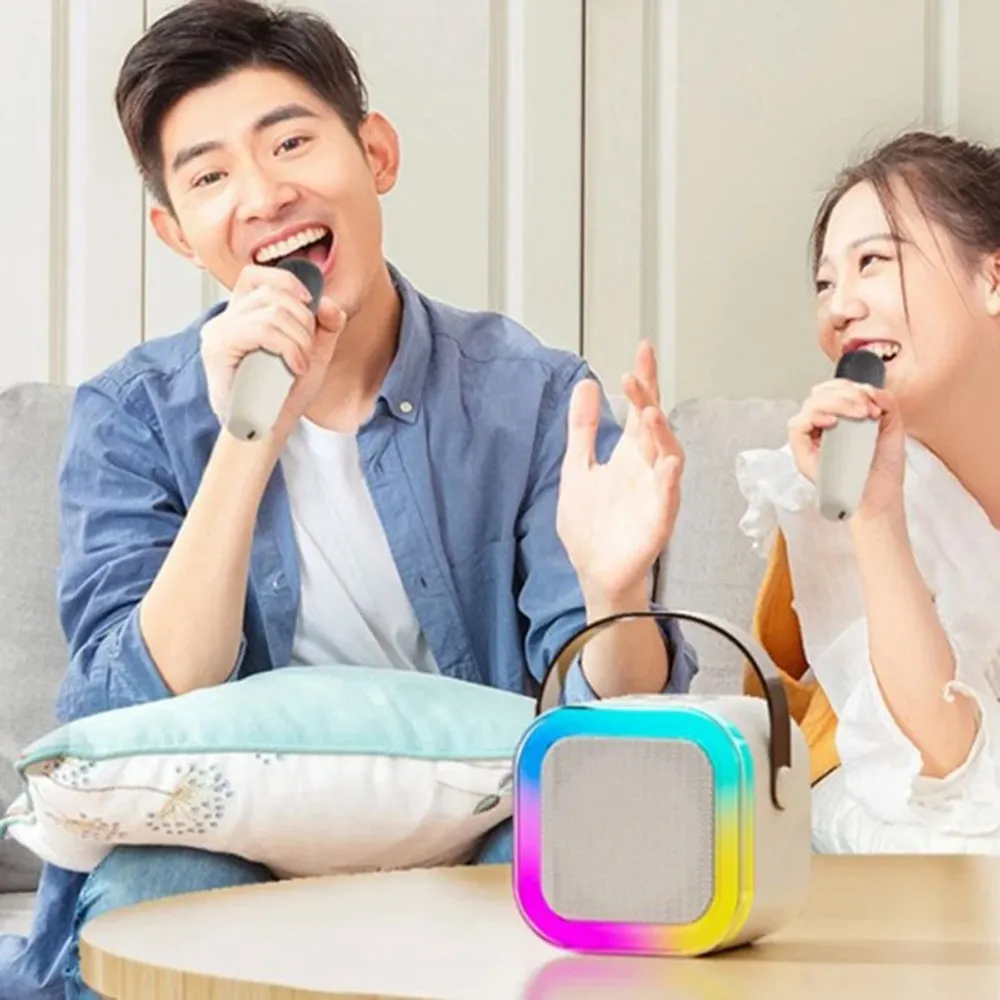 Караоке-колонка K12 – ваш идеальный компаньон для веселых вечеров: с двумя микрофонами, динамичной подсветкой и возможностью подключения по Bluetooth.