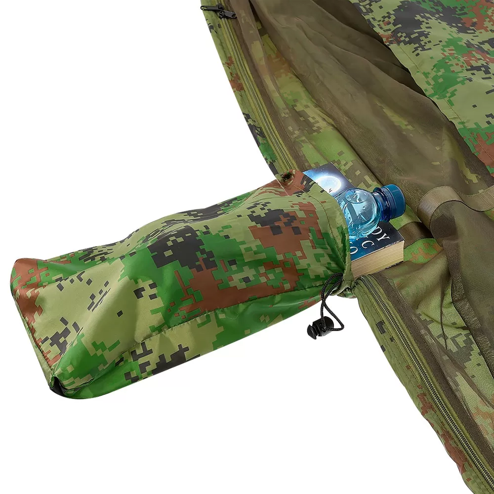 Легко помещается в рюкзак, компактен и удобен в переноске. Москитная сетка пришита вдоль гамака с одной стороны, с другой – закрывается на молнию. Гамак легко складывается в специальный чехол. Также его можно стирать в стиральной машинке. Сбоку туристического гамака находится удобный карман, в который вы можете положить телефон, бутылку с водой или любые другие мелочи.