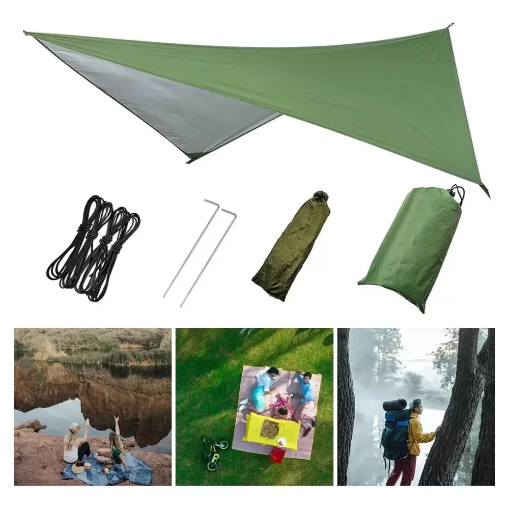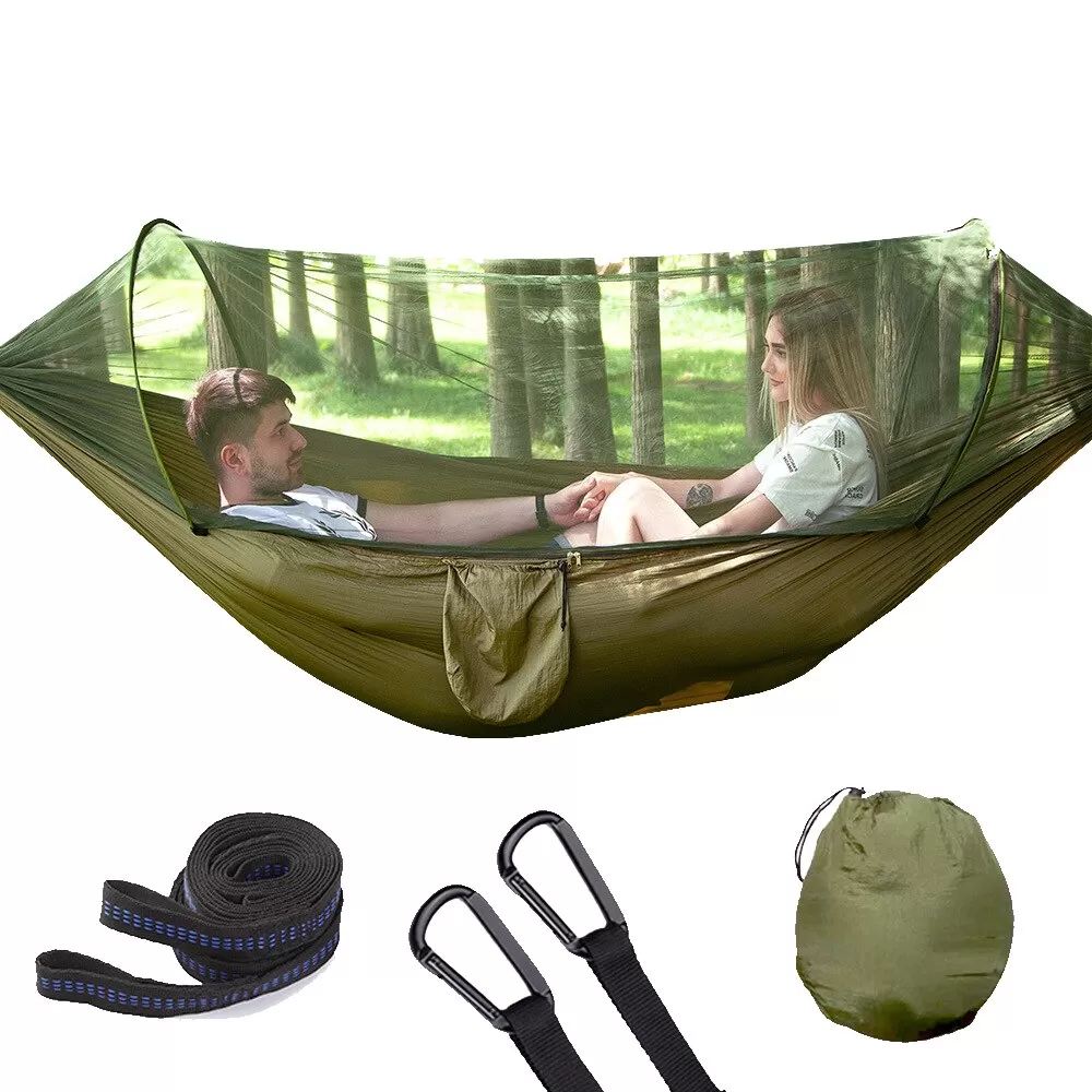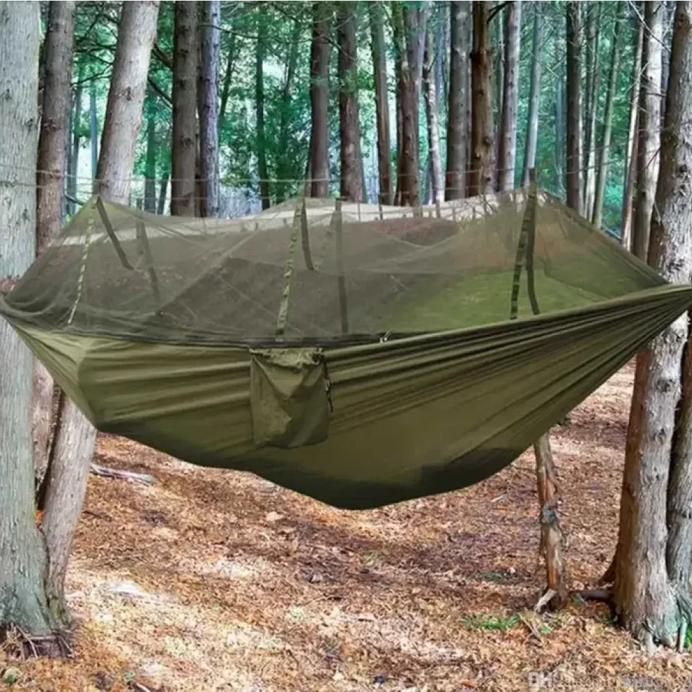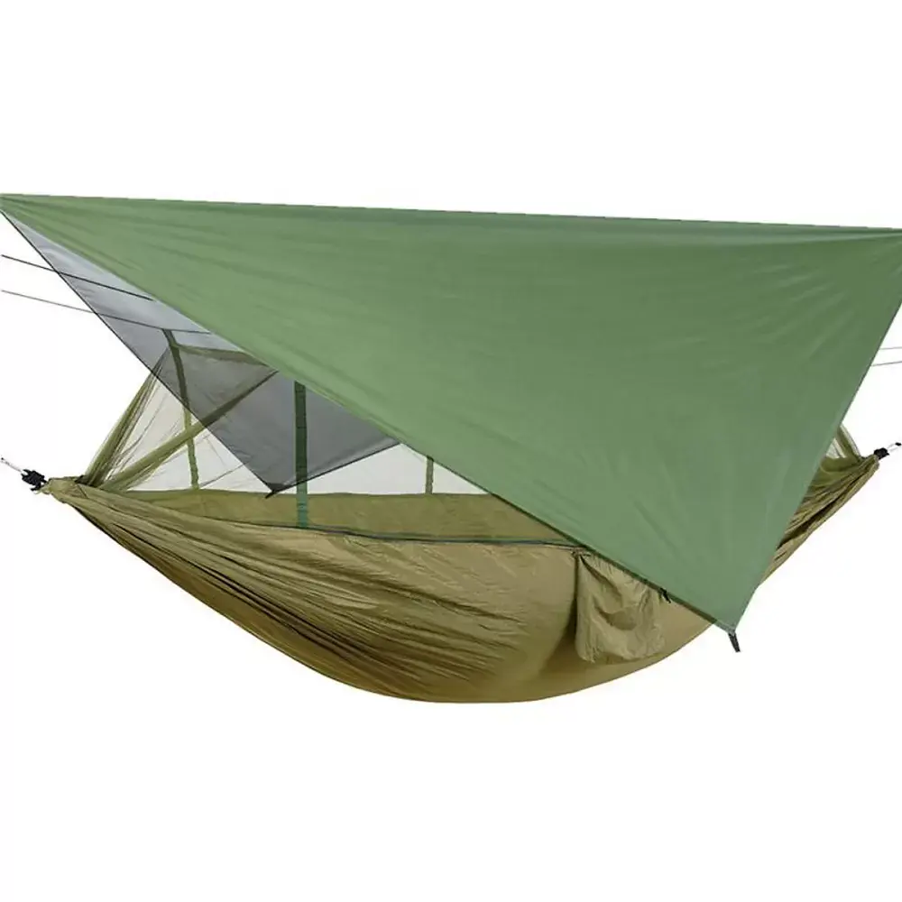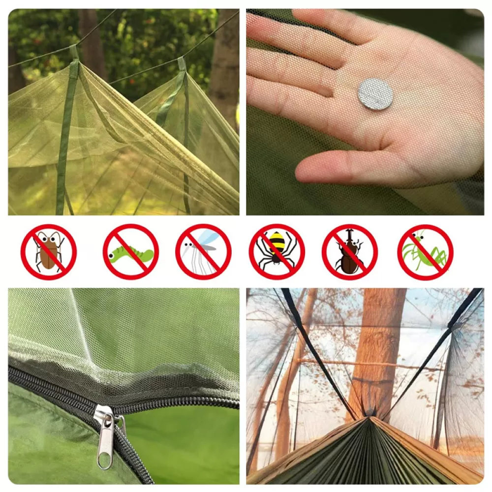 Гамак производный с москитной сеткой и тентом в комплекте надежно оградит вас от насекомых и их укусов. Может использоваться как палатка, коврик для пикника, пляжный коврик, гамак, дождевик, брезент для кемпинга, укрытие от дождя, турист брезент, упаковка и т.д. Изготовлен из полиэстера высокой плотности 210D Oxford ripstop. Водостойкий и износостойкий, устойчивый к разрыву, многоразовый, хороший компаньон для путешествий.