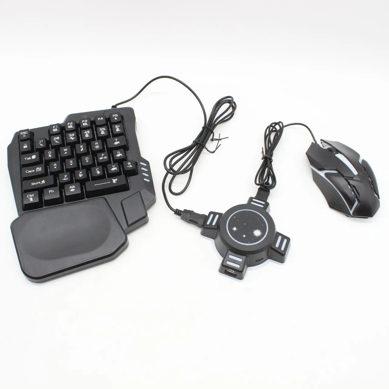 Клавиатура оснащена светодиодной RGB подсветкой, тип свечения — статичный. Ход клавиш мягкий. Мышь проводная, с динамической подсветкой. Адаптер для подключения к консолям. В адаптере 2 разъема USB, для подключения клавиатуры и мыши, а также стандартный разъем для наушников.