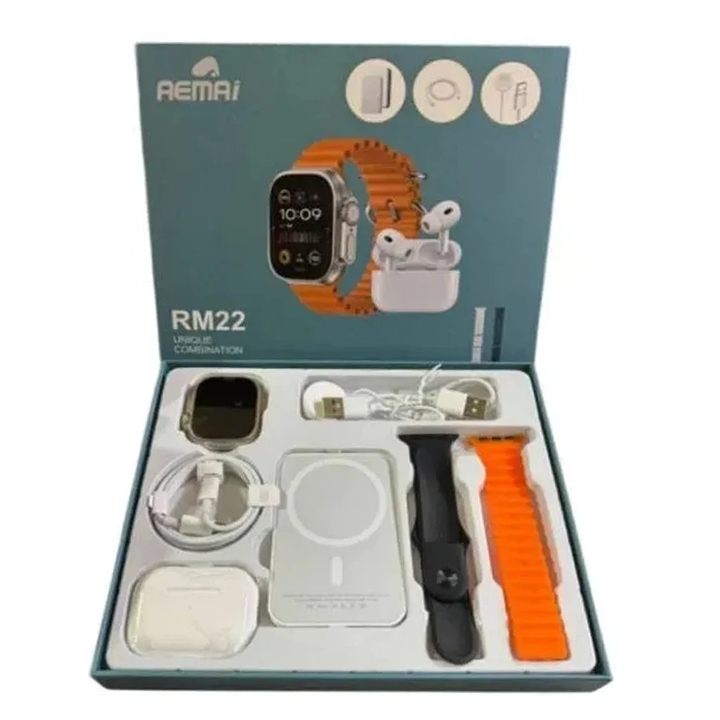 Смарт часы RM22, Ремешки – 2шт, Беспроводные наушники в кейсе, Беспроводной Power Bank, USB кабель для зарядки часов, Кабель зарядный для Power Bank