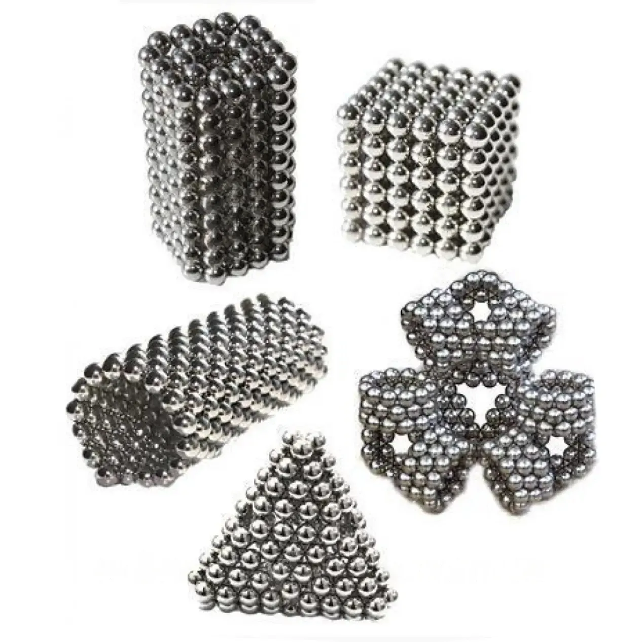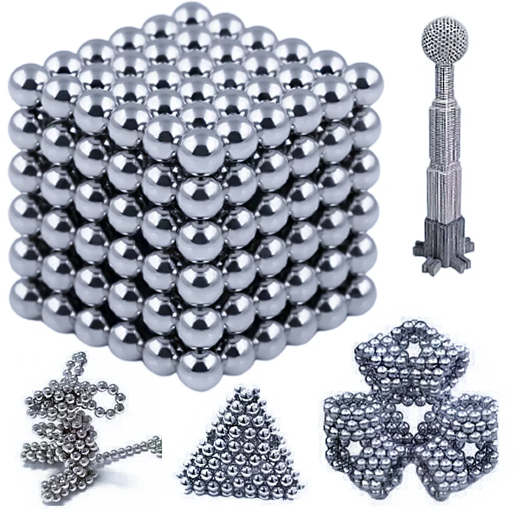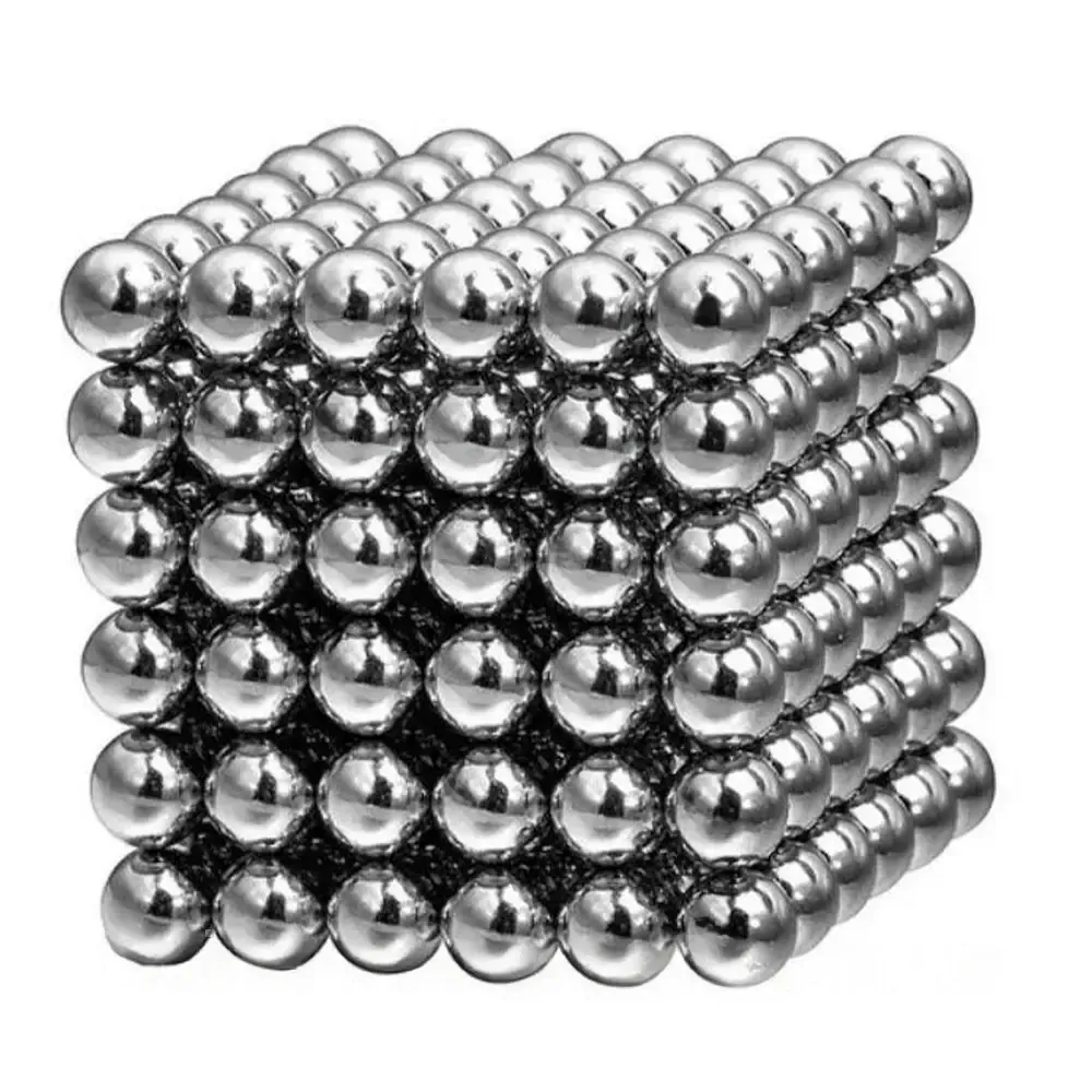 Неокуб состоит из 216-ти сильно намагниченных шариков из сплава Nd14Fe21B (неодим – редкоземельный металл с высокой и долговременной магнитной устойчивостью), с намагниченностью N38 и диаметром 5 мм. Из этих шариков можно создавать любые фигуры и узоры – от классических форм (куб, пирамида, шар) до сложных абстрактных композиций.