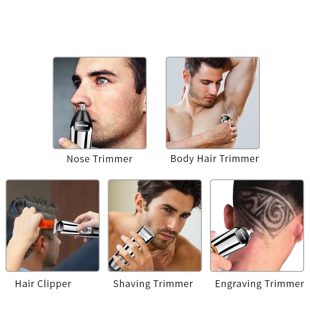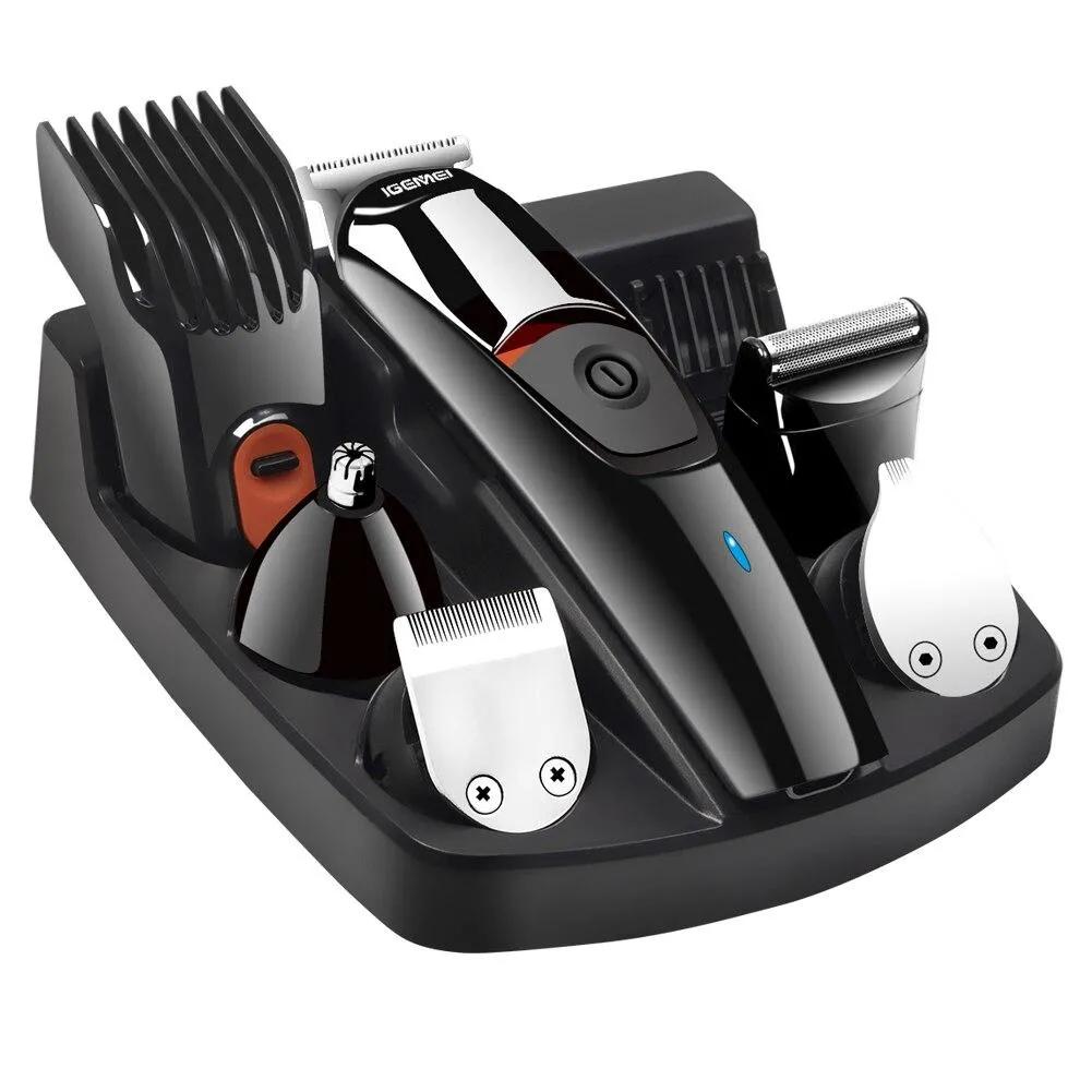 Набор для стрижки оснащен 6 сменными насадками для стрижки: головкой для стрижки волос, триммером для бороды, бритвой для волос, триммером для носа, триммером для бровей. Одно устройство обеспечит удобную стрижку всего тела. Может работать как от сети, так и от встроенного аккумулятора на протяжении часа. Время зарядки составляет 8 часов.