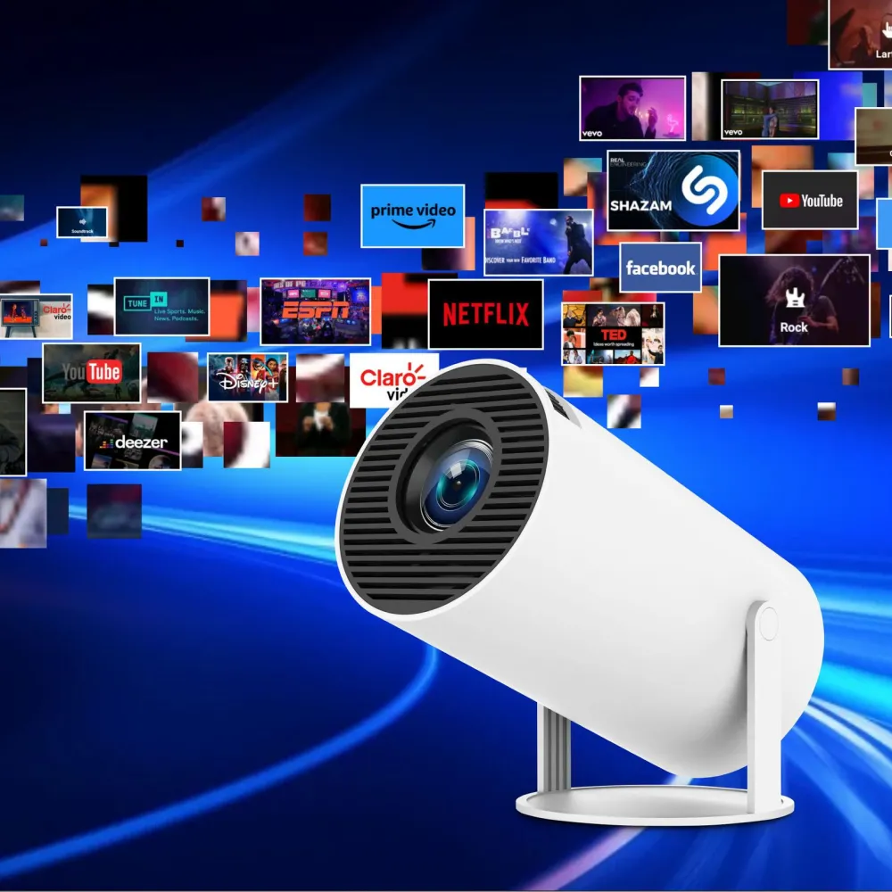 Портативный проектор HY300 — это универсальное устройство со встроенной Smart TV, выполненное в стиле Samsung Freestyle. Мини-проектор поддерживает видео в разрешении до 4K (реальное разрешение 1280×720), обеспечивая яркое и четкое изображение. Работает на базе операционной системы Android 11, что позволяет использовать YouTube, Netflix, Chrome и другие приложения, которые можно установить напрямую на проектор.