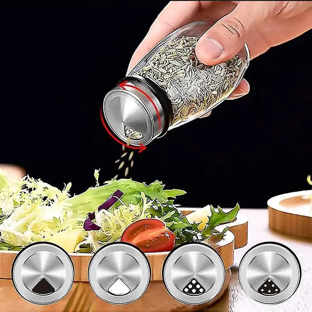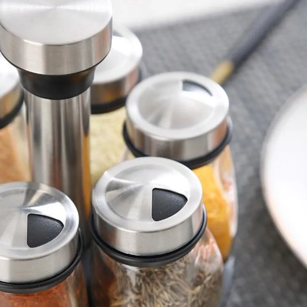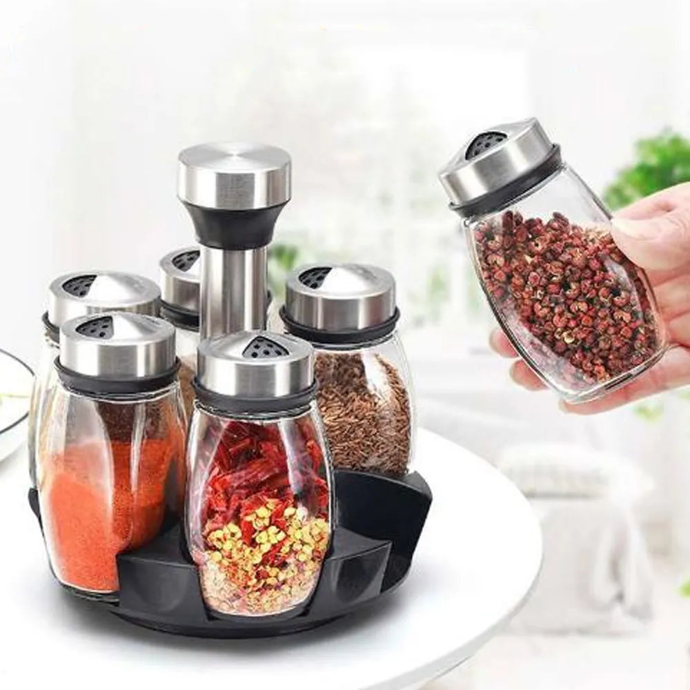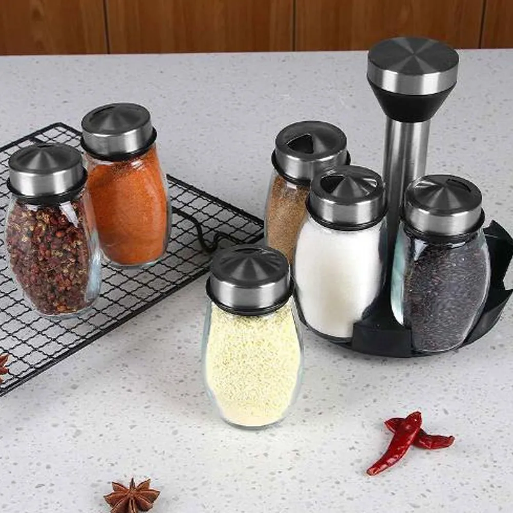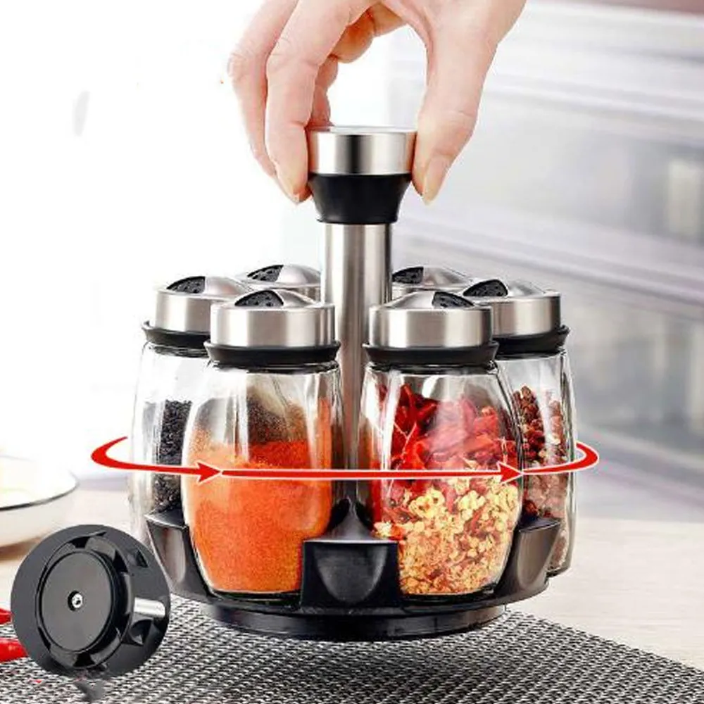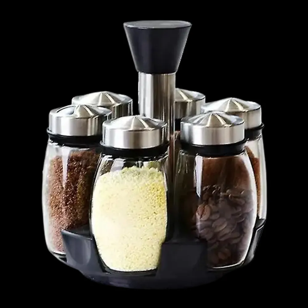 Комплект включает в себя шесть отдельных емкостей, предназначенных для хранения различных специй, приправ и соли. Все контейнеры установлены на специальной подставке, которая позволяет им вращаться на 360 градусов, обеспечивая моментальный доступ к необходимым специям.