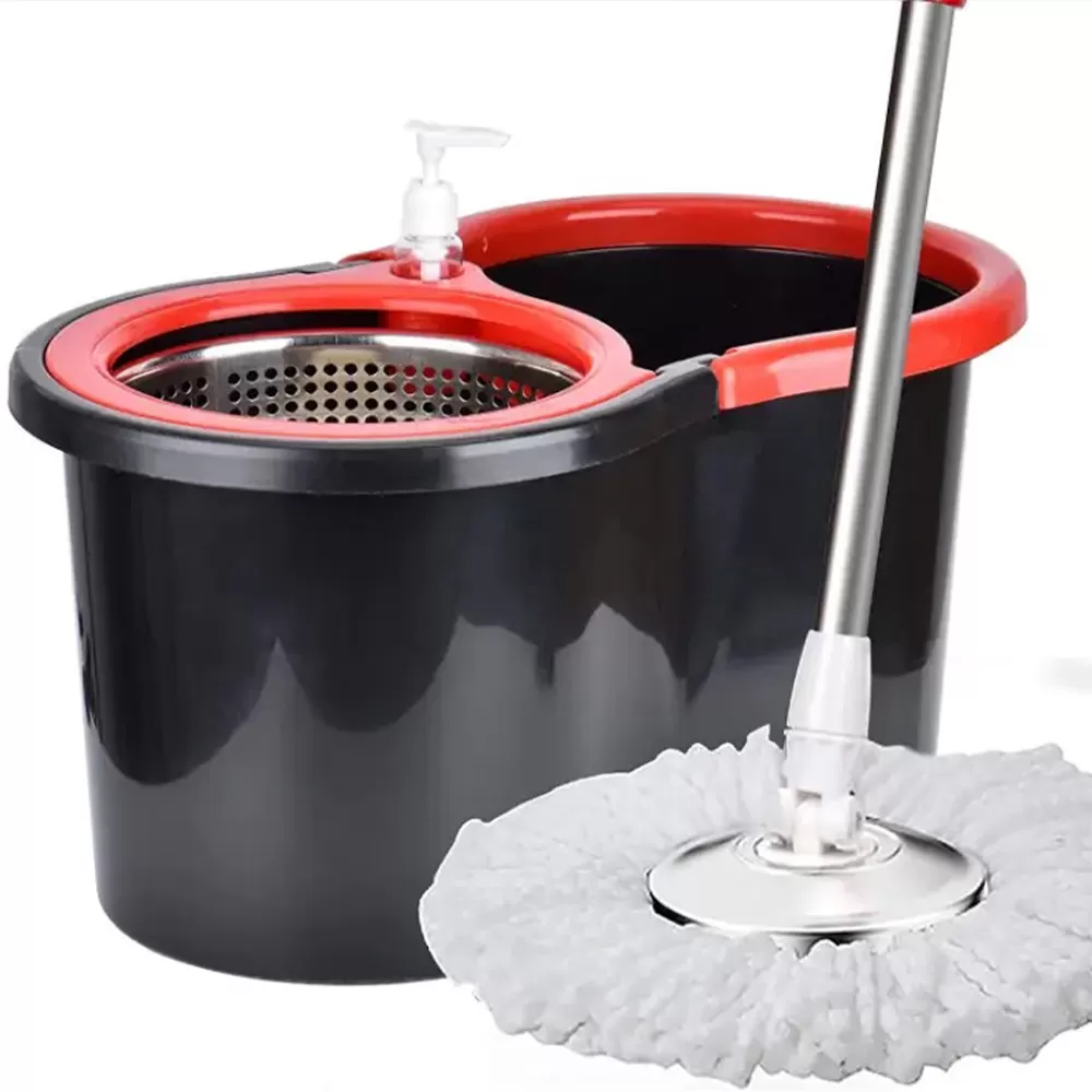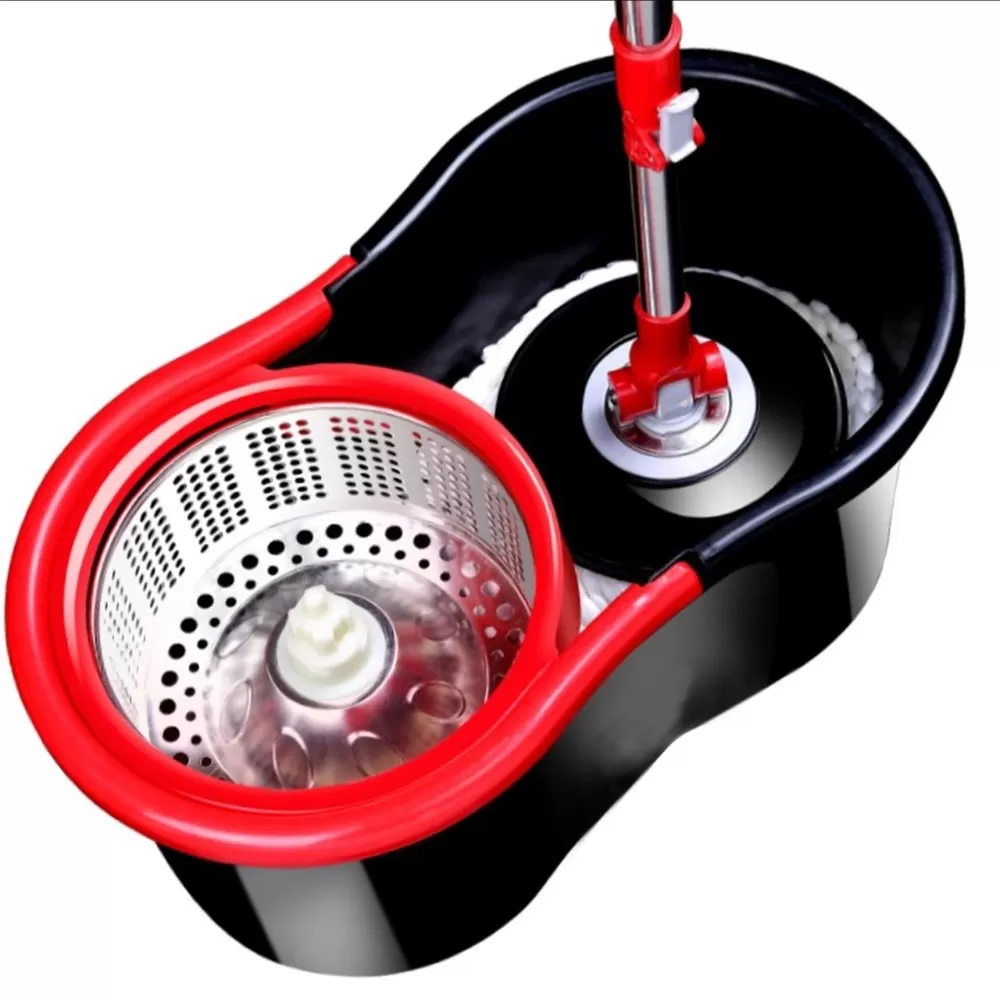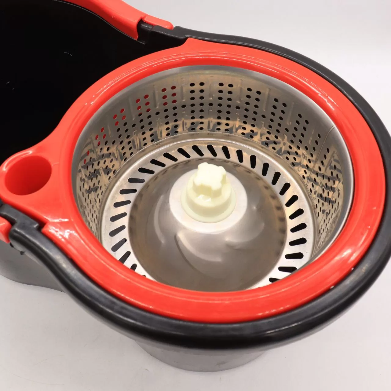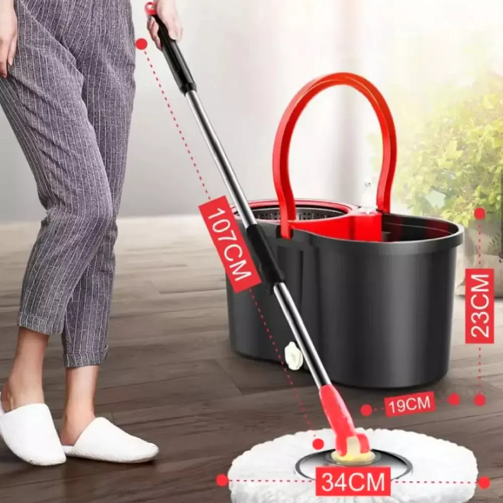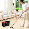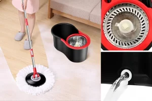 На ведре для мытья пола установлено специальное устройство, которое с помощью центробежной силы позволяет отжимать насадку швабры. Это устройство расположено внутри телескопической рукоятки и автоматически производит процесс отжима и полоскания насадки. У ведра также есть колеса, что делает его удобным для перемещения во время уборки.