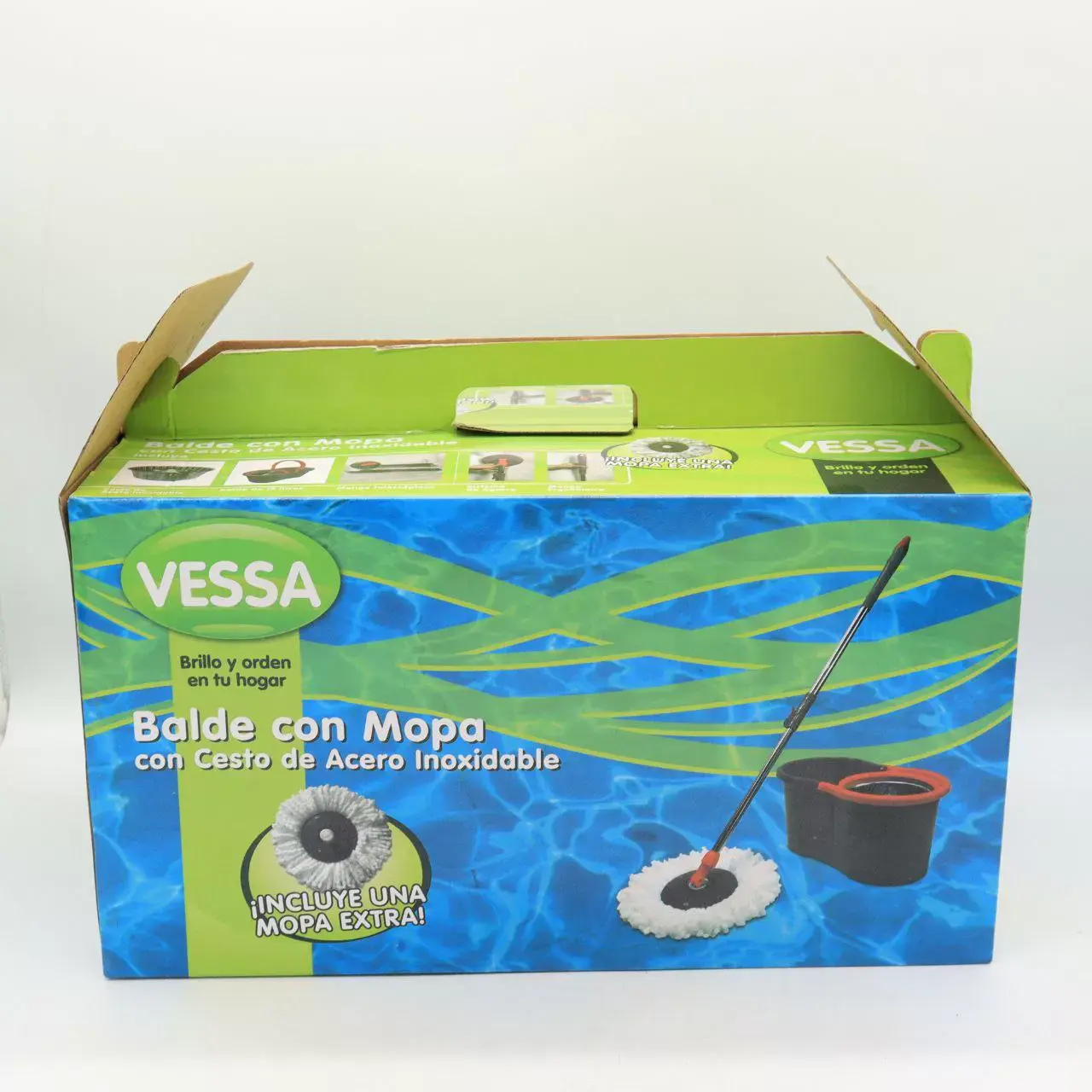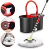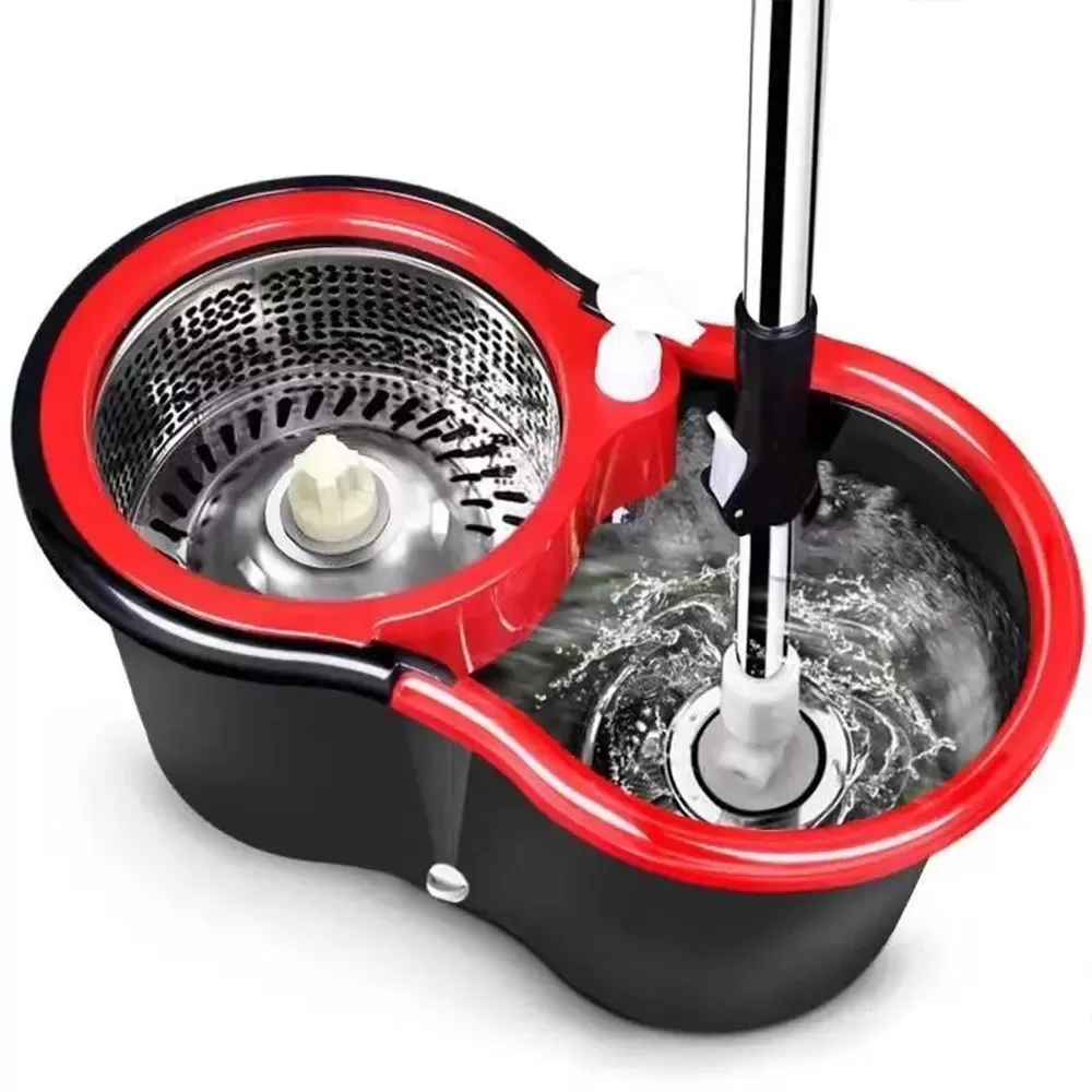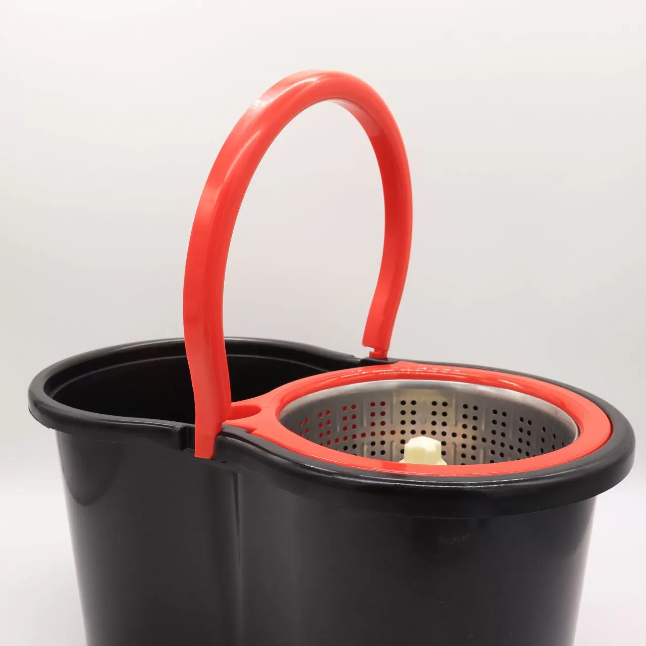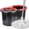 На ведре для мытья пола установлено специальное устройство, которое с помощью центробежной силы позволяет отжимать насадку швабры. Это устройство расположено внутри телескопической рукоятки и автоматически производит процесс отжима и полоскания насадки. У ведра также есть колеса, что делает его удобным для перемещения во время уборки.