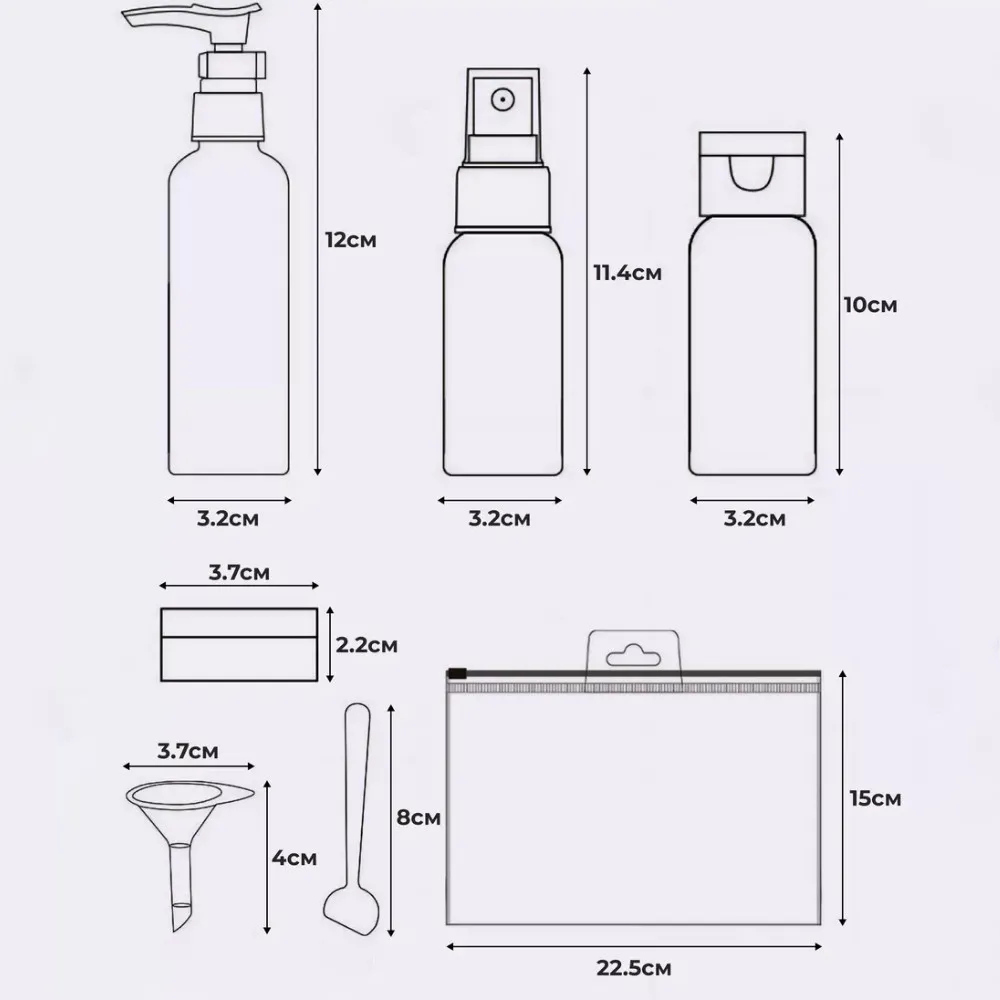 Этот тревел набор баночек имеет удобные размеры емкостей соответствуют требованиям ручной клади, что избавляет вас от лишних забот при прохождении контроля в аэропорту. С его помощью вы сможете взять с собой любимые средства, такие как гели, кремы, лосьоны и шампуни, не переживая о возможных протечках. Набор дорожных емкостей — это практичное и стильное решение для каждого путешественника, которое поможет вам с легкостью организовать свои вещи.