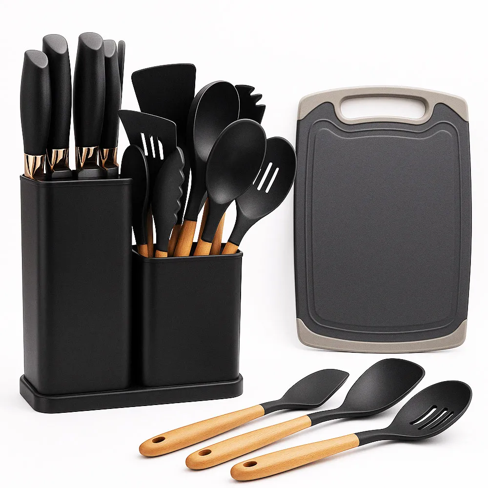 Преобразите свою кухню с нашим премиальным набором кухонных принадлежностей из 19 предметов! Идеальное сочетание стиля, функциональности и безопасности.