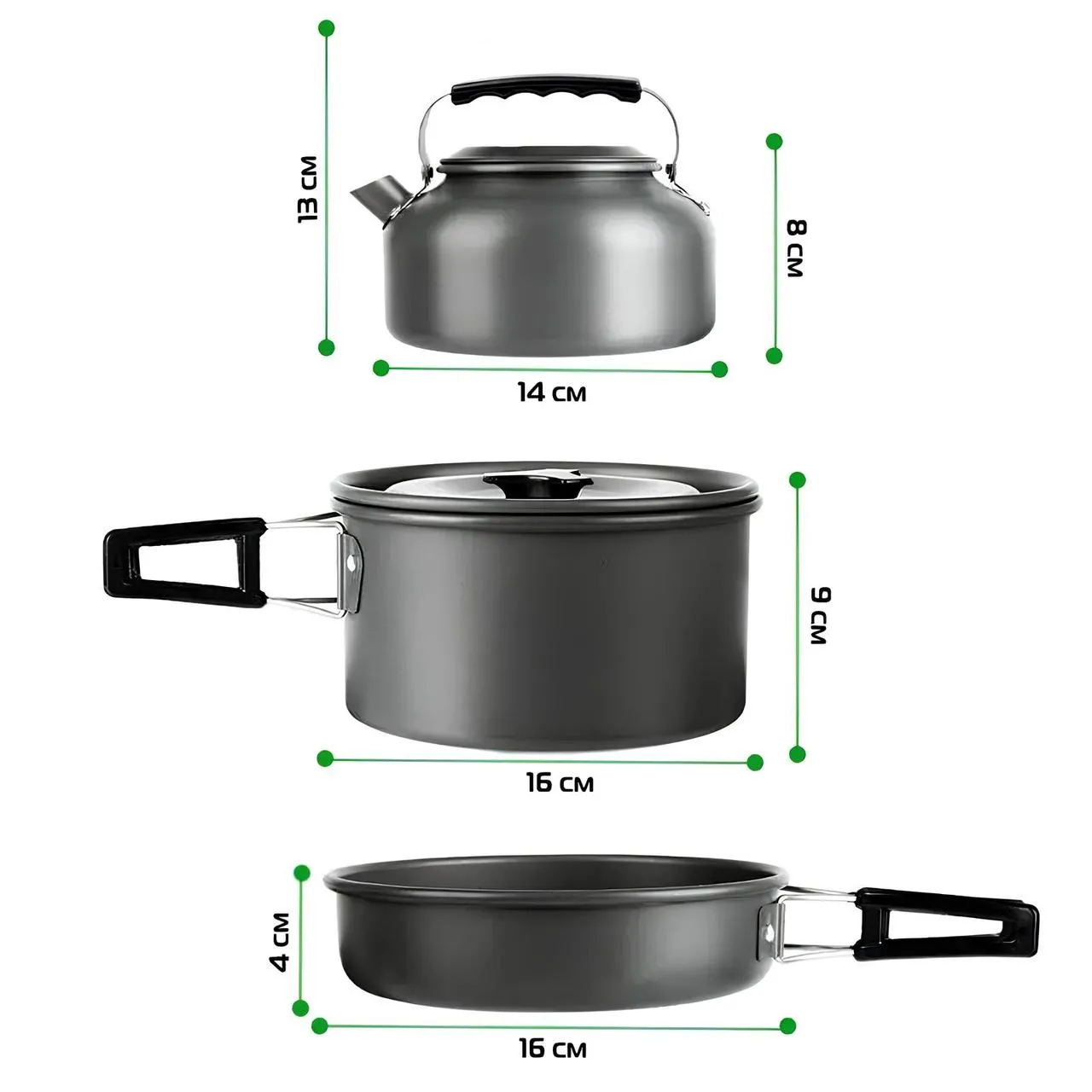 Изготовлен из высококачественного алюминиевого сплава MA-71 с надежным термическим покрытием, что гарантирует прочность и долговечность. Посуда подходит для использования на открытом огне, газовых горелках и кострах. Легкий и компактный набор из трех предметов с удобными складными ручками станет незаменимым помощником во время рыбалки, пикников, походов и любых видов отдыха на природе.