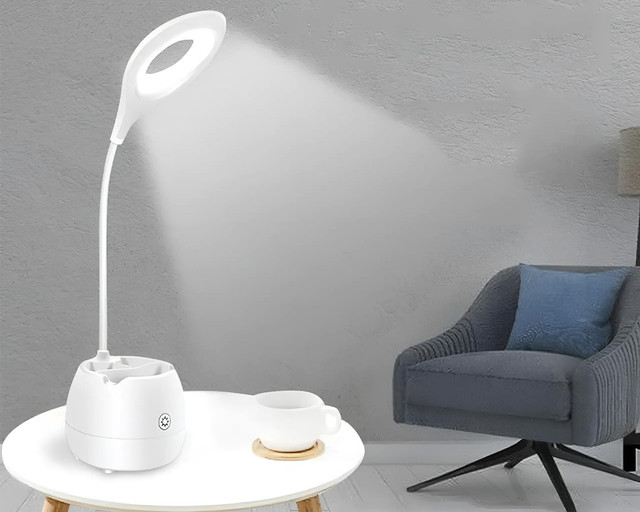 Светодиодная технология гарантирует высокую энергоэффективность и яркое освещение при минимальном потреблении энергии. Регулировка яркости позволяет создать комфортную атмосферу для работы или отдыха. Гибкая ножка обеспечивает индивидуальную настройку угла освещения, а встроенный органайзер – удобное хранение канцелярских принадлежностей и телефона.