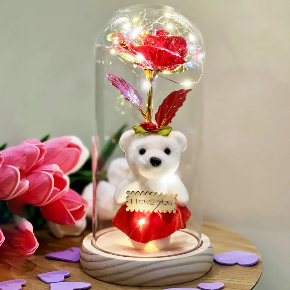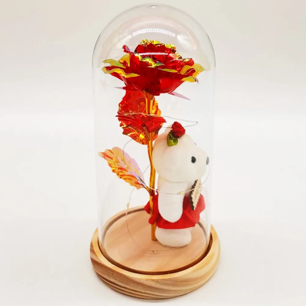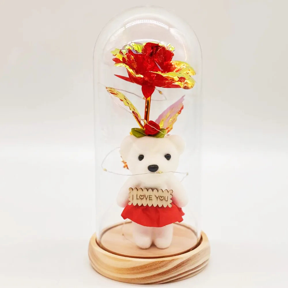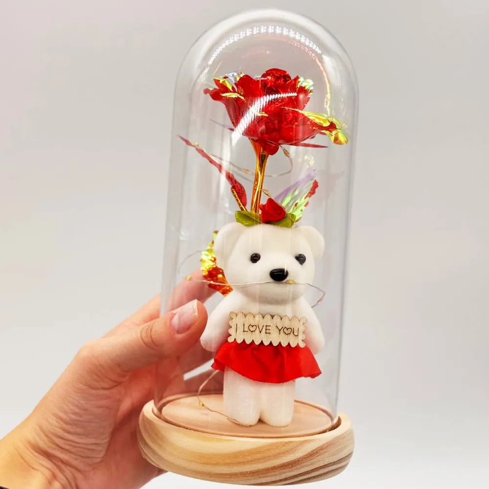 Роза в колбе с мишкой и подсветкой 21см, на батарейках A-7 / Ночник вечная роза под куполом / Подарочная роза