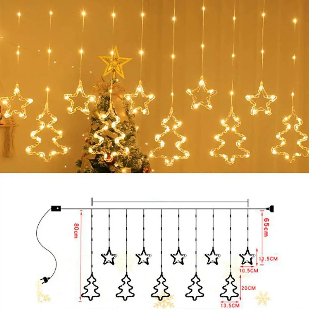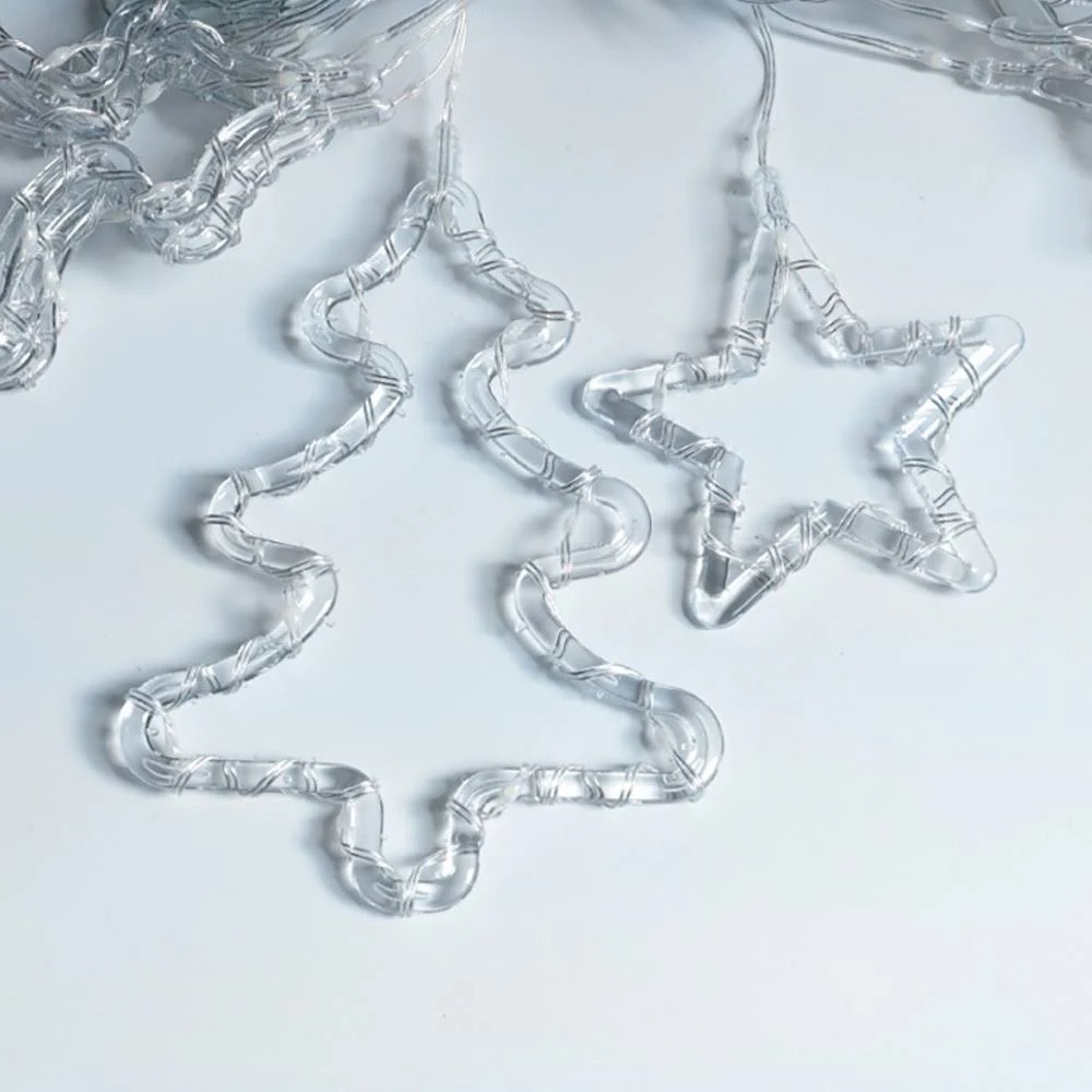 Гирлянда штора — это великолепное украшение для окон, которое наполняет дом атмосферой праздника и уюта. Она состоит из фигур звезд, снежинок и елочек, которые переливаются мягким теплым светом, создавая эффект падающего снега и сияющего неба. Легкая установка делает ее идеальным решением для декорирования любого пространства.