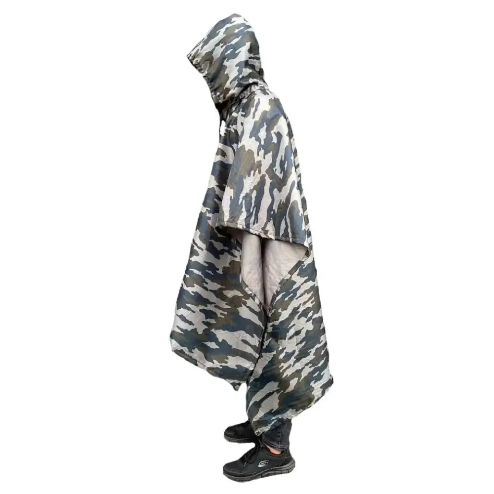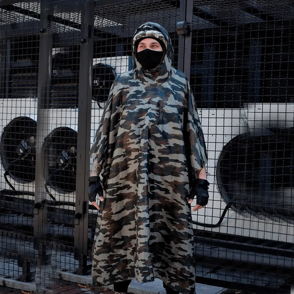 Свободный крой накидки обеспечивает удобство и универсальность: её можно надевать поверх любой одежды, не стесняя движений, а также закреплять поверх рюкзака или другого переносимого снаряжения. Для дополнительной фиксации предусмотрены боковые застёжки, которые надёжно закрепляют пончо, усиливая защиту от неблагоприятных погодных условий. Регулируемый капюшон с шнуром позволяет подстроить его под индивидуальные потребности, обеспечивая комфорт и защиту от ветра или дождя. Эта накидка станет отличным выбором для туристов, рыбаков, охотников и всех, кто ценит практичность и многофункциональность в одном изделии.