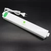 - Закрываем крышку, фиксируем обе защелки. Нажимаем кнопку включения, загорится красная лампочка. Упаковщик начинает откачивать воздух из пакета. Как только лампочка сменит цвет на зеленый, процесс упаковки завершен. Время вакуумации и заваривания шва определяется автоматически.
