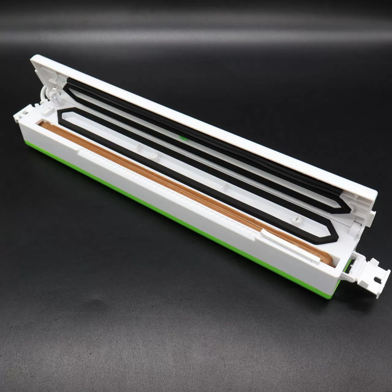 - Устанавливаем пакет в специальный зажим в правой части упаковщика таким образом, чтобы открытый срез пакета находился ровно посередине между уплотнительными лентами.