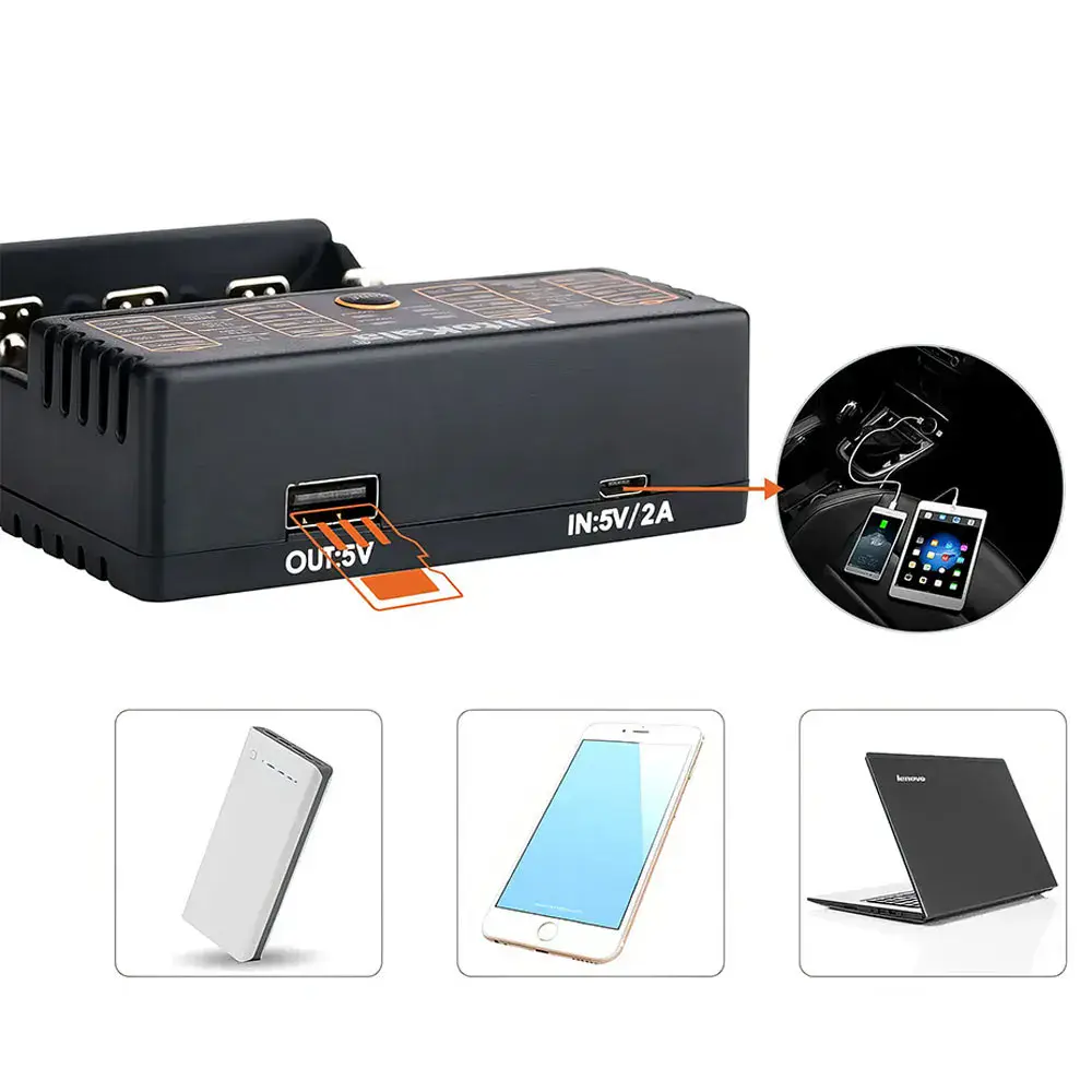 Универсальное зарядное устройство Liitokala Lii-402 с 4-мя каналами и функцией Power Bank — идеальное решение для зарядки самых разных аккумуляторов. Поддерживает широкий спектр форматов батарей, включая 18650, 26650, AA и AAA, что делает его незаменимым помощником для любого пользователя.