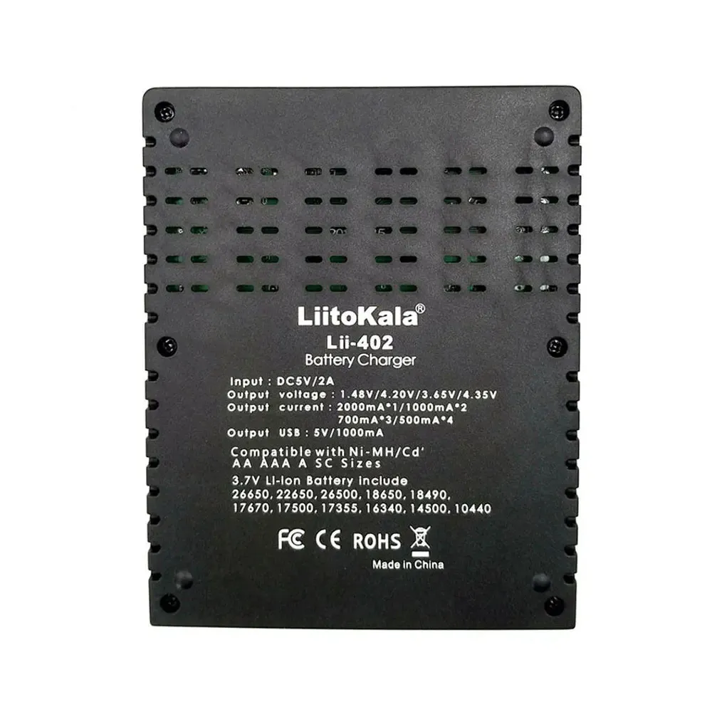 LiitoKala Engineer Lii-402 — это интеллектуальное зарядное устройство, отличающееся универсальностью и удобством использования. Автоматическое определение типа аккумулятора (Li-ion, LiFePO4, Ni-MH и Ni-Cd) избавляет от необходимости иметь несколько зарядных устройств.